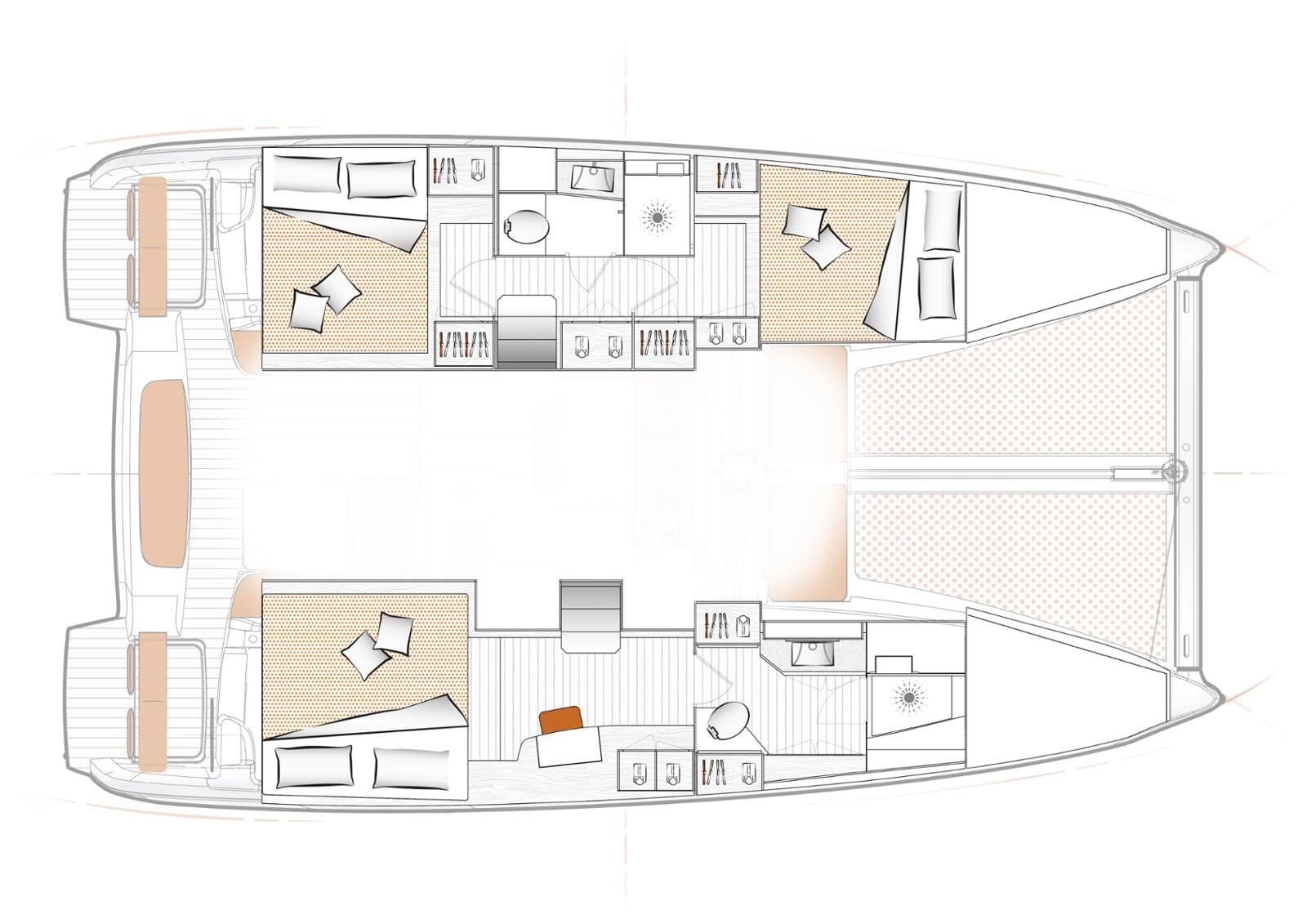 Made for couples & families: Private owner’s suite with king-size bed and ensuite; two additional double cabins with an own bath/shower.